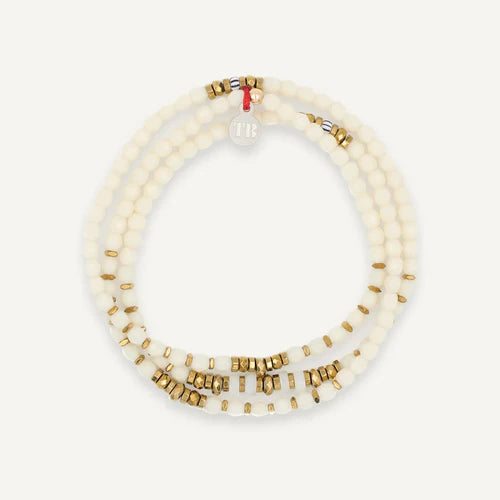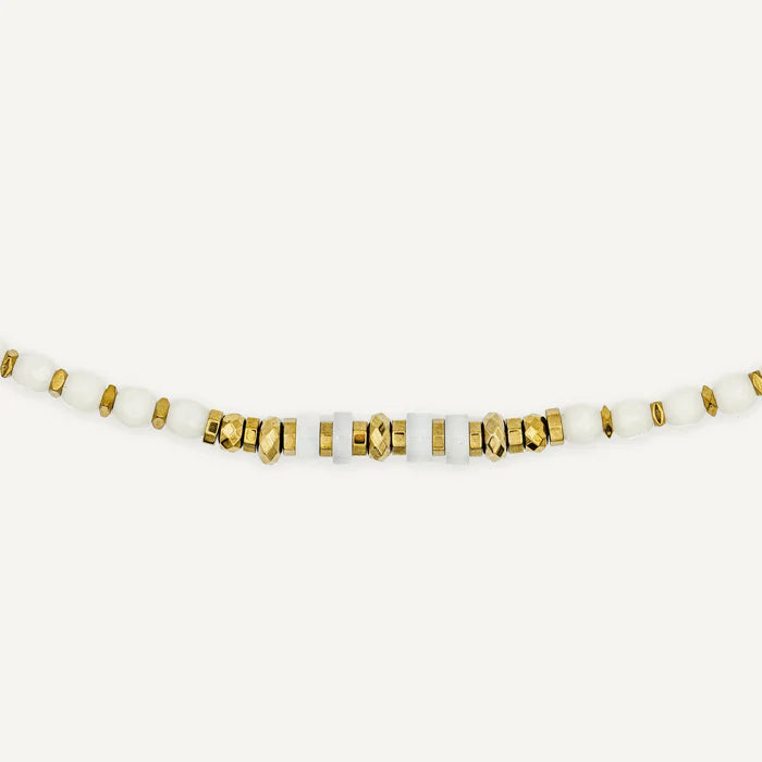 Le Blondie 3 - Vanille est un bijou féminin réalisé avec des perles de bohème facettées dans une teinte douce Vanille, associées à des perles Heishi en nacre. Ce bijou 2-en-1 s’adapte à vos envies et peut se porter en collier ou en bracelet triple tour.
