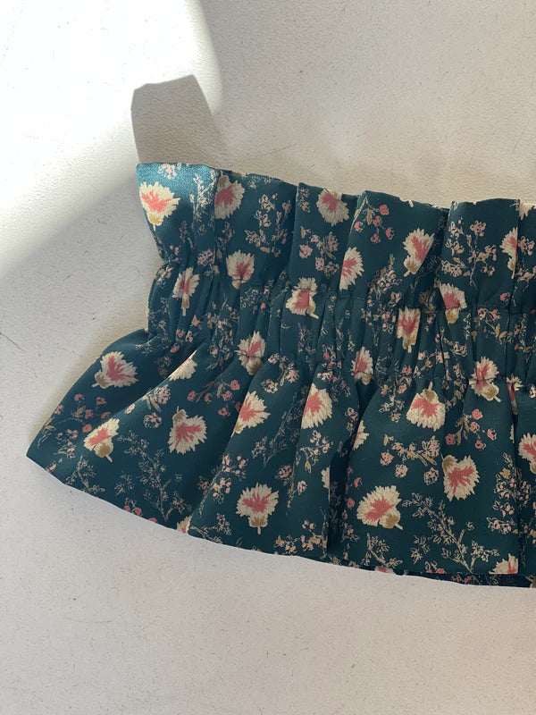 Son motif délicat mêle fleurs et plumes sur un tissu fluide et aérien. Le fond vert canard met en valeur les nuances de vieux rose et d'ocre, créant une harmonie subtile et raffinée.