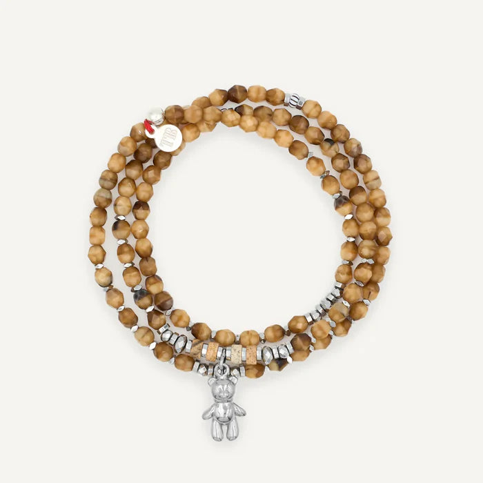 Retrouvez l’esprit de l’enfance avec le DOUDOU DEDE - Caramel, un pendentif ourson en peluche en argent 925 brillant, accompagné d’hématite et de perles de bohème caramel. Ce bijou 2-en-1 se porte aussi bien en collier qu’en bracelet triple tour. Confectionné sur un fil élastique sans fermoir, il allie confort et praticité. Chaque étape de fabrication est contrôlée pour garantir une qualité irréprochable.