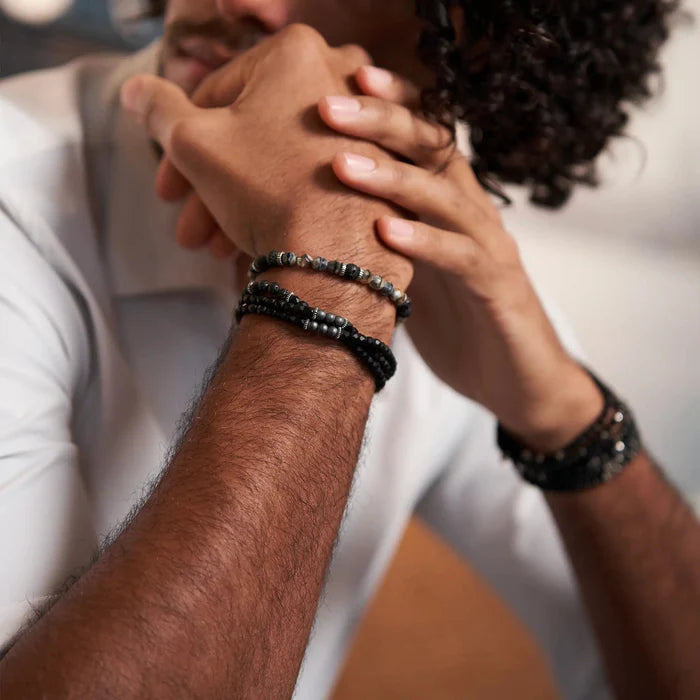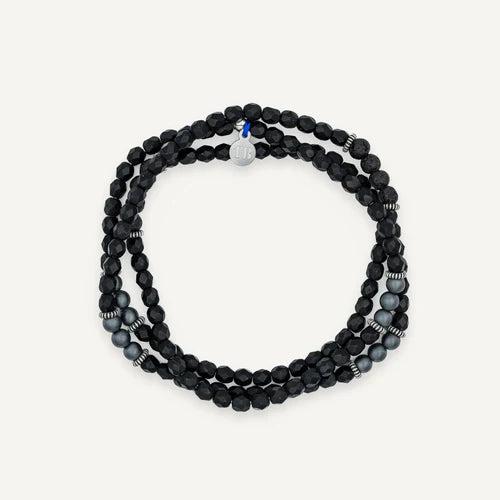 Le Gentleman Silver Noir Mat est un bijou 2-en-1 conçu pour homme, à porter en collier ou en bracelet triple tour. Il peut aussi se porter en collier pour femme. La pierre de lave se marie parfaitement avec le Noir Mat grâce au contraste des éléments en hématite et cristal. Ce bijou est monté sur un lien en silicone solide, sans fermoir et ajustable pour un confort optimal.