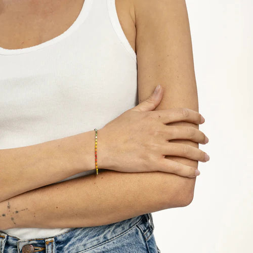 Le NIJI GOLD 1 est un bracelet femme à un tour, réalisé avec des perles d’hématite dorée et des perles Miyuki ultra-fines. Son design délicat et coloré apporte une touche lumineuse et subtile à vos tenues.