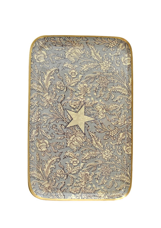 Découvrez ce plateau Flower de Boncoeurs en couleur vert de gris, mesurant 42 x 26,5 x 2 cm. Conçu en aluminium émaillé à 100 %, il se distingue par une bordure finie à la main en doré, alliant élégance et robustesse.