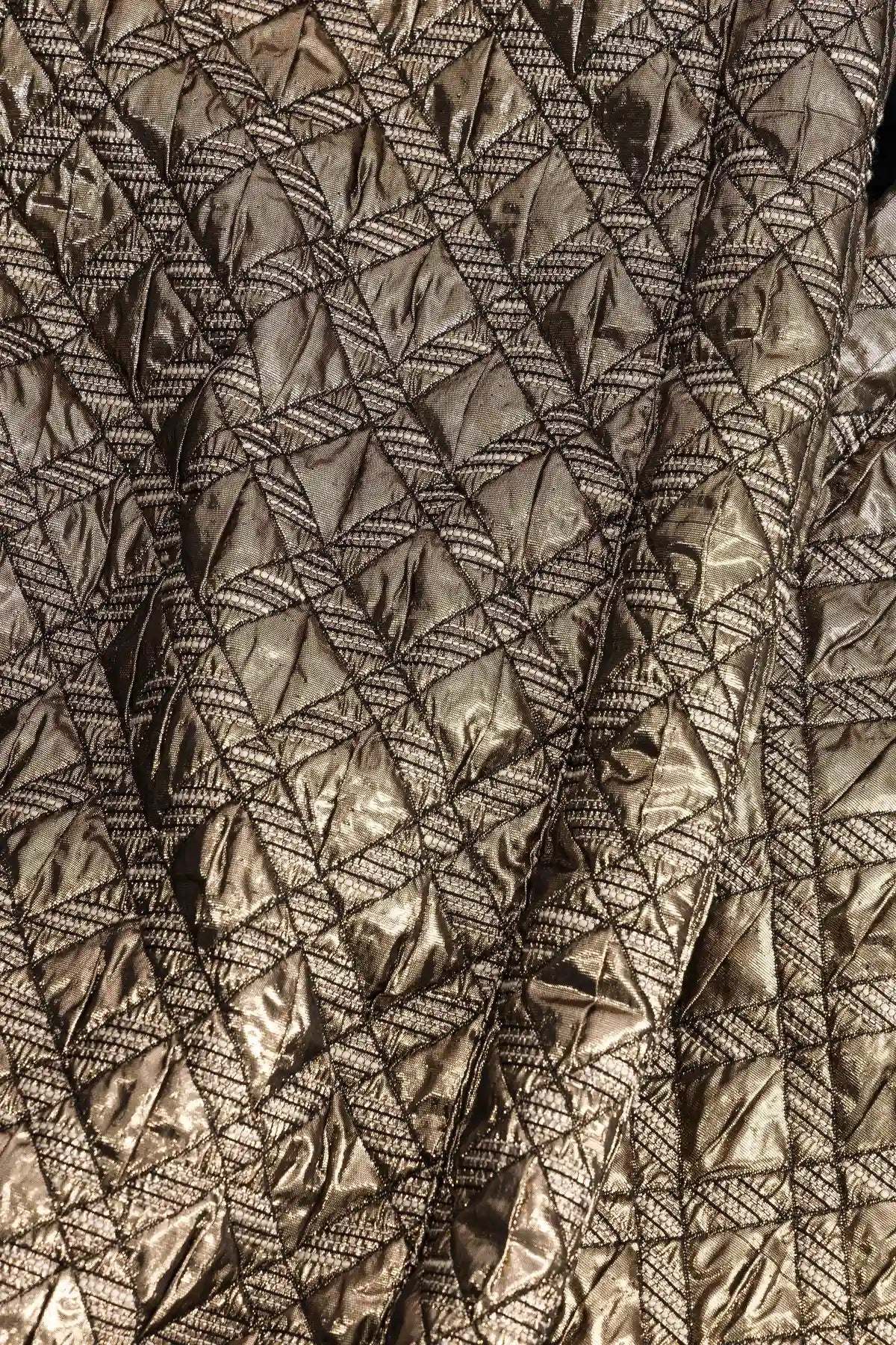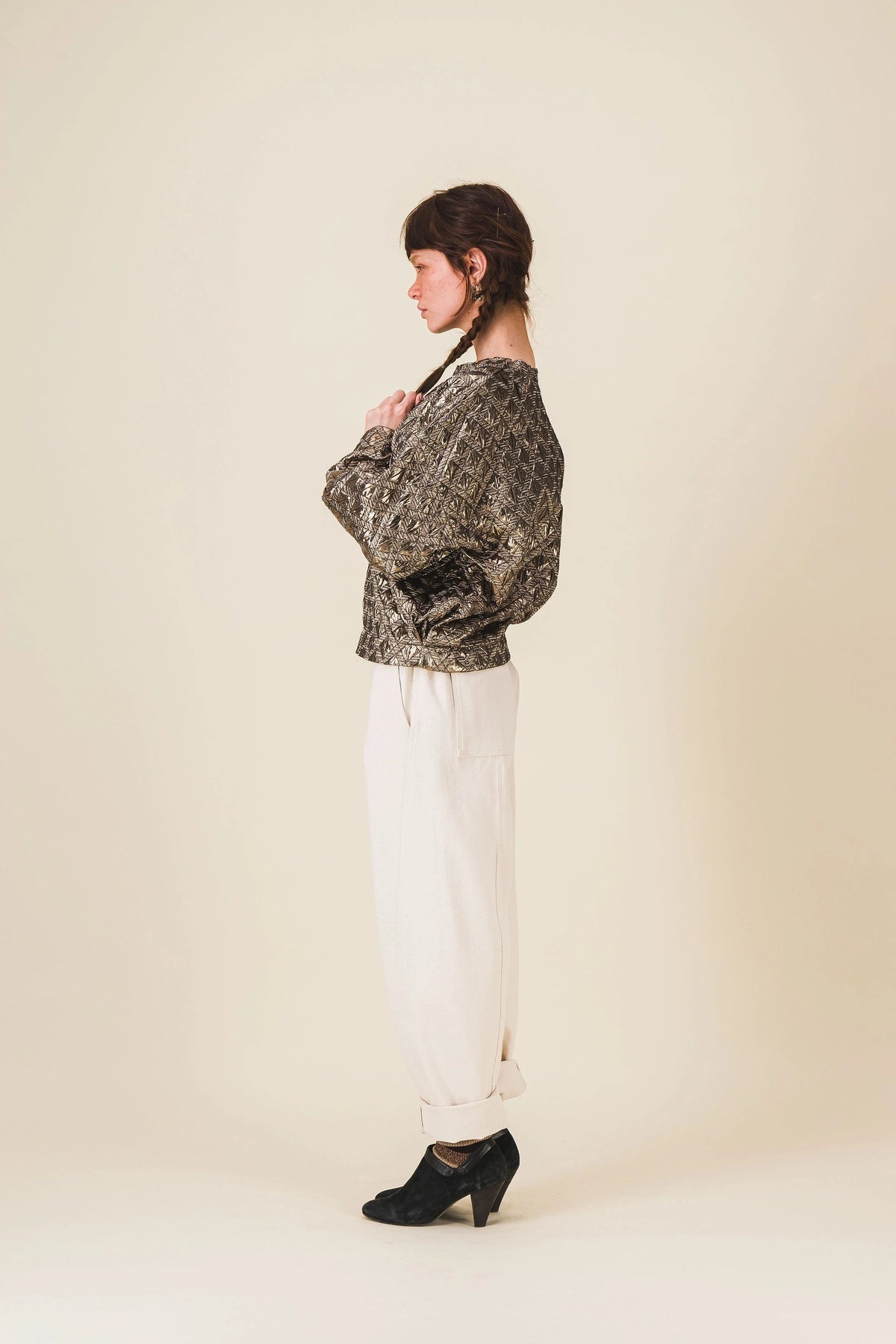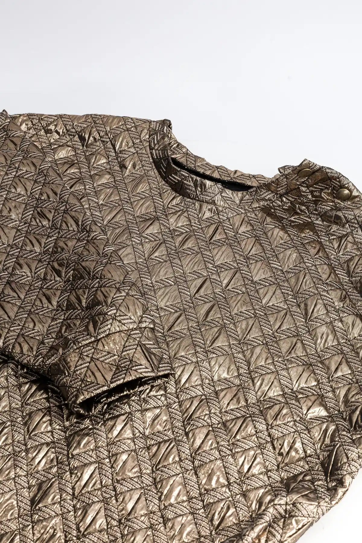 Ce sweat oversize, réalisé en jacquard métallisé tissé en France, affiche un motif losange bronze avec un effet matelassé. Il présente une coupe ample, une matière structurée et un système de boutons pression sur un côté du col pour une touche unique.